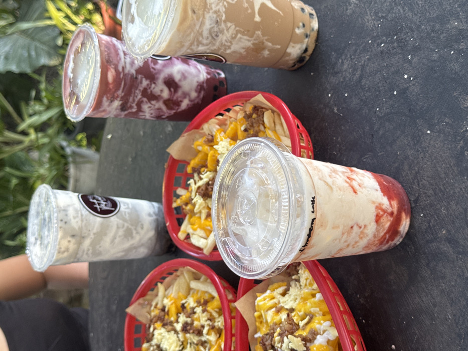 A collection of food and beverages is displayed on a dark, textured table, likely at an outdoor or semi-outdoor establishment in Koronadal, Philippines. Four clear plastic cups with dome lids contain various layered drinks: one in the foreground is labeled "Strawberry Latte" with distinct red and white layers; another features dark sediment at the bottom and a creamy white top, bearing a "The Boba" logo; a third displays swirled red and white layers with dark boba pearls; and the fourth contains a light brown, swirled beverage also with dark boba pearls. Three red plastic oval baskets, each lined with brown parchment paper, hold servings of french fries. These fries are topped with melted yellow cheese, shredded white cheese, and crumbled brown meat. The upper left background reveals the out-of-focus arm and shoulder of a person wearing a dark top, while blurred green foliage suggests a natural, outdoor setting. The table surface is dark gray or black, marked with scattered white speckles.