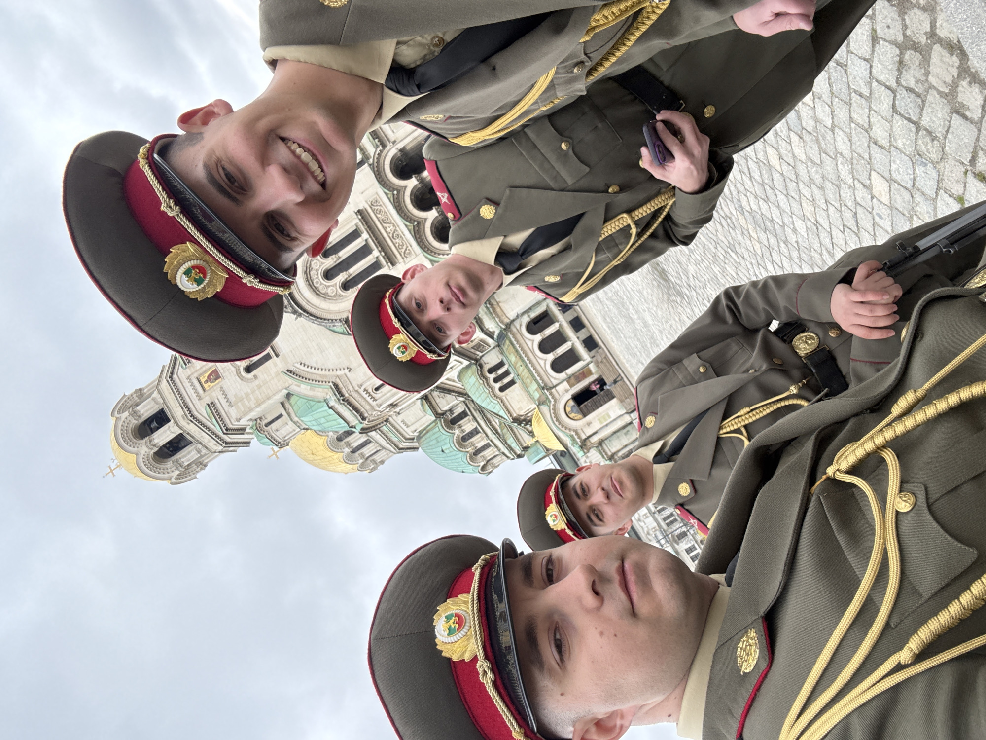 A selfie shows four men in Bulgarian military dress uniforms in front of the Alexander Nevsky Cathedral in Sofia, Bulgaria. The men are dressed in olive green uniforms with gold colored accents and military hats. The bottom left man is looking down at the camera. The man in the upper left is smiling at the camera. Two other men are positioned in the middle ground. One of the men on the right is holding a rifle. The cathedral is prominently featured in the background.