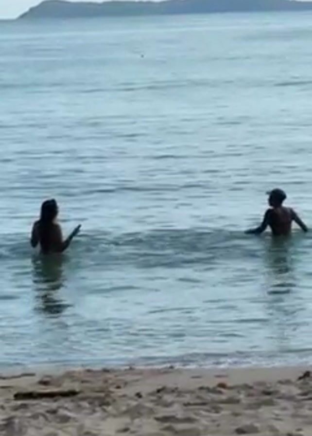 Two people, possibly a man and a woman, are standing in the ocean near a beach. The person on the left has longer hair and is seen with their arms raised slightly. The person on the right, presumably the man, is standing facing away from the camera. There is an island visible in the distance. The sand of the beach is visible in the foreground. The ocean is calm with small waves lapping at the shore.