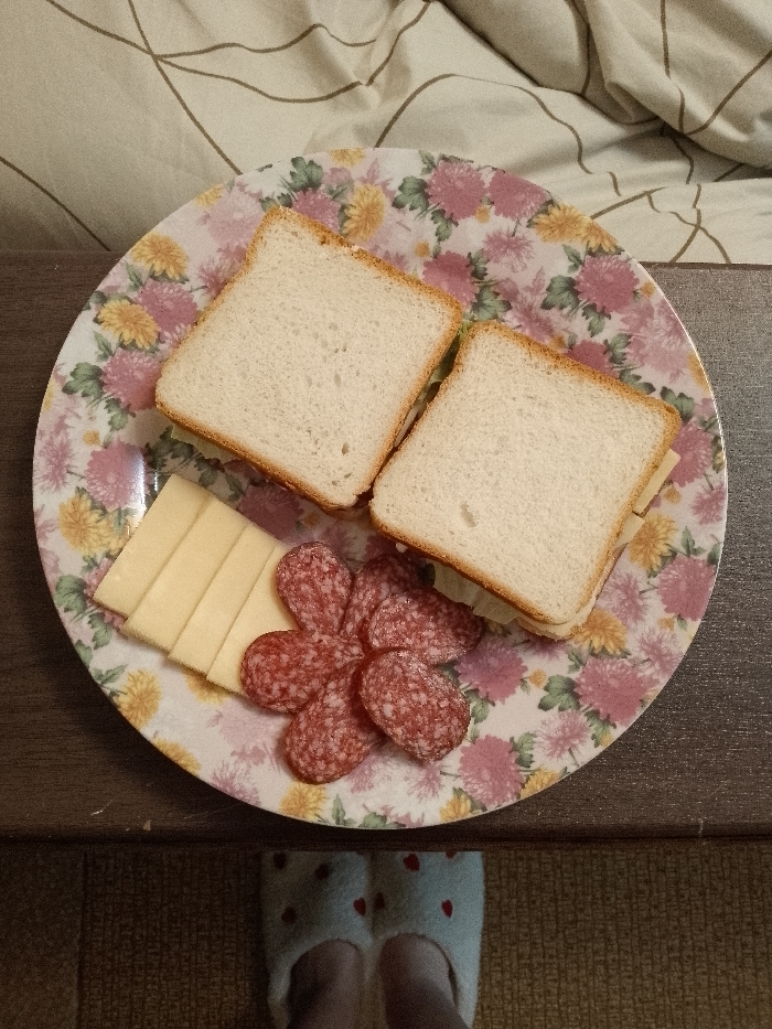 A floral patterned plate holds two square-cut sandwiches, a fan of sliced cheese, and a salami flower. The plate rests on a dark wood surface, partially covered by a patterned cloth. Below, fuzzy slippers with red hearts are visible on a tan carpet. The scene is well-lit, showcasing the meal's arrangement.
