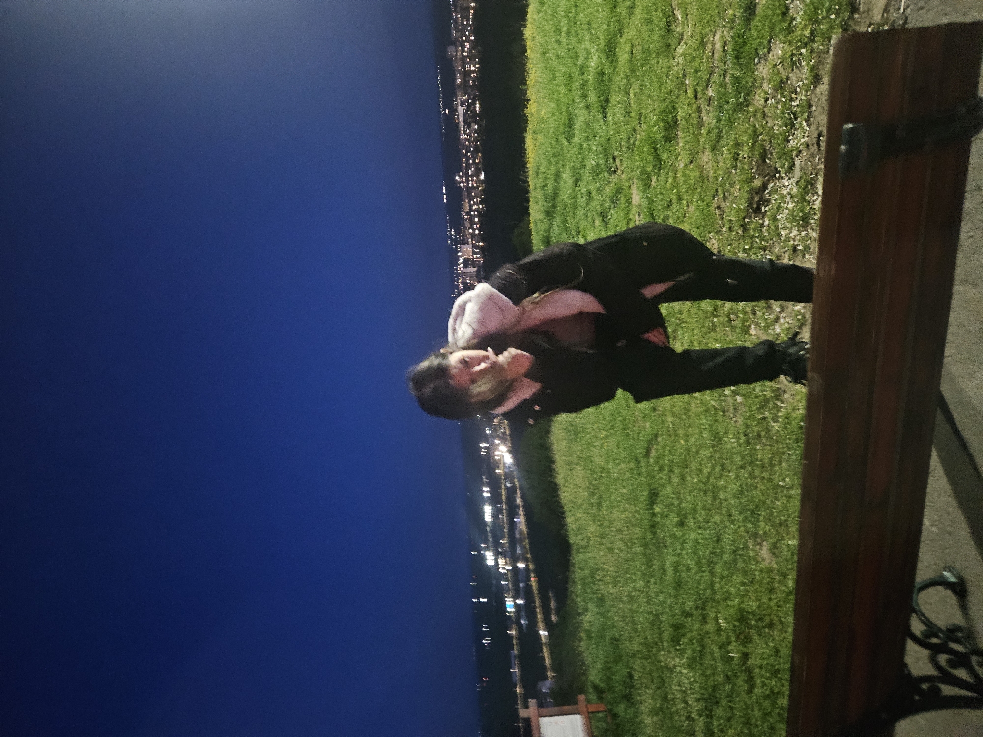 A woman stands on a grassy hill, leaning on a park bench, at night in Yambol, Bulgaria