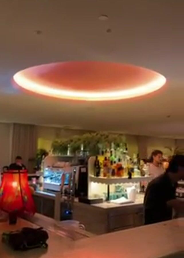 interior of a bar or restaurant. Several people are standing behind and sitting at the bar. The room is softly lit with recessed ceiling lights. A pink-shaded, circular, light fixture is centered over the bar. A lamp with a red shade sits on the bar counter. A selection of bottles is lined up behind the bar. There are a few other tables populated with patrons in the background of the scene. Music plays in the background.