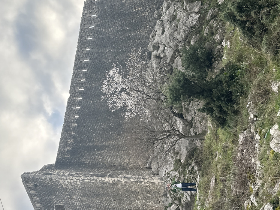 The image depicts a section of a stone fortification wall on a rocky hillside in Dobrota, Montenegro, under an overcast sky