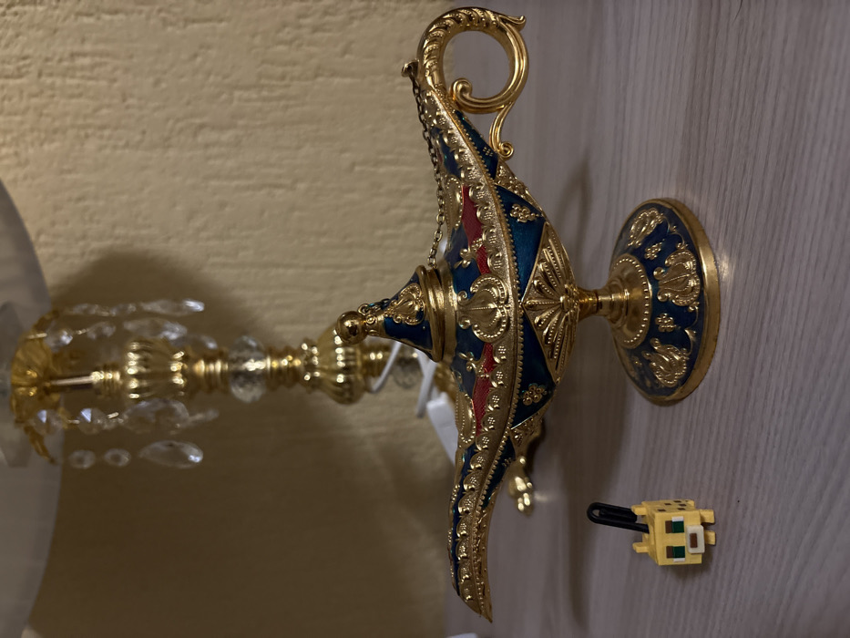 The scene is set indoors in Mikrevo, Bulgaria. A highly ornate, decorative genie lamp, finished in gold with extensive blue and red enamel detailing, rests on a light wood-grain surface in the foreground. To the immediate left of the lamp, a small, blocky yellow figurine with black markings and green eyes, consistent with a Minecraft-style ocelot or cat, features a black attachment loop on its back. In the blurred background, an illuminated golden table lamp, characterized by a white lampshade and multiple clear crystal drop embellishments suspended from its central column, is situated against a plain, light beige wall. No people are visible.