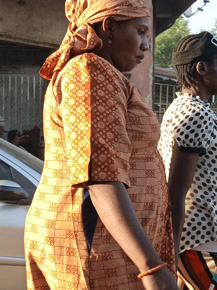 The image captures two women standing outdoors in Gwagwarwa, Nigeria, under natural daylight