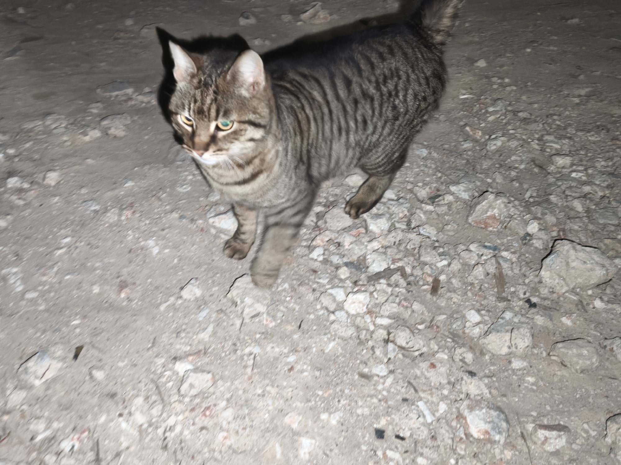 - "A striped tabby cat stands on a rough, stone-strewn surface in a dimly lit environment" by FM-RFmi62, licensed under CC BY 4.0