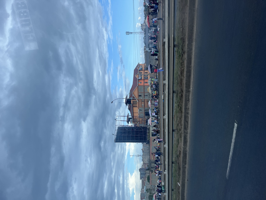 A slightly rotated street scene with a dark gray road taking up half the frame. A thin green median strip separates the road from a bustling marketplace. People with umbrellas are congregated next to a building. Beyond that, a city skyline under a blue and cloudy sky. An incomplete rectangular structure is in the foreground on the left. Part of the word "CLUBB" is visible in the top left corner, likely reflected on the window of a vehicle.