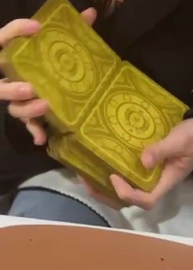 A person shuffles a deck of gold-colored tarot cards with a patterned back