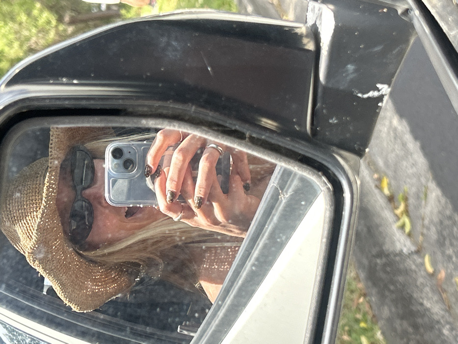 A person is reflected in a car side mirror, taking a selfie. They wear a straw hat and sunglasses. The person holds an iPhone in their hands with a clear case, showing nail art on the fingertips. The car mirror is black, and the background reflects green foliage.