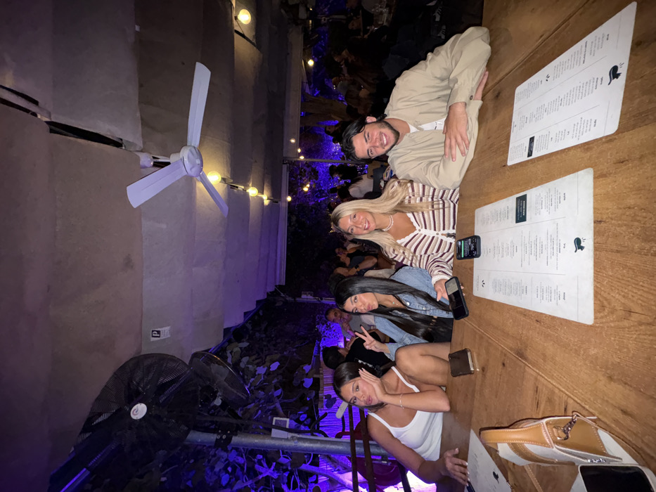 The image depicts four individuals, three females and one male, seated at a dark wooden table within an outdoor dining or bar establishment at night