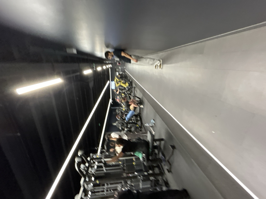 A blurry gym scene shows a narrow room with rows of stationary bikes. Several people are on the bikes. The walls are a combination of dark and light colors. A man in a t-shirt and sweatpants stands at the far end of the room. Long, linear lights illuminate the walls and ceiling. The image's perspective is distorted, making the room appear unusually elongated.