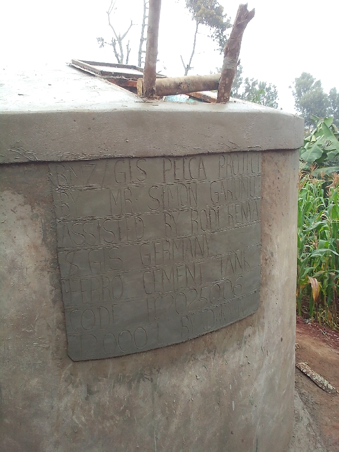 The image displays a concrete cylindrical water storage tank situated in Ihururu, Kenya