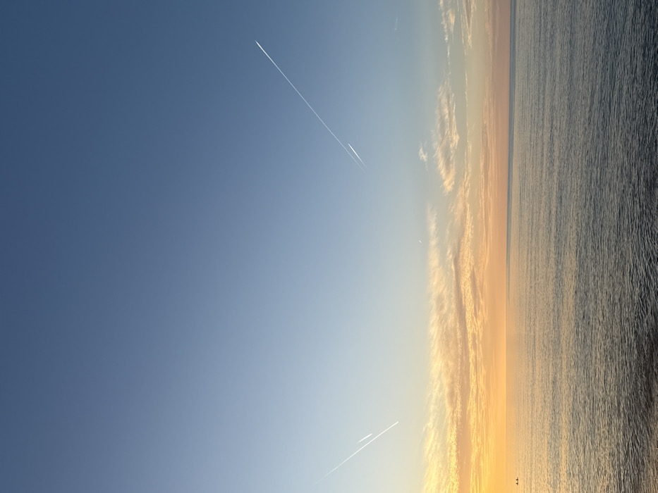 The image displays a coastal view over the Black Sea at Batumi, Georgia, under a sky exhibiting gradient hues consistent with either sunrise or sunset. The sky transitions vertically from a deep blue at the zenith to a lighter blue, then to vibrant orange and yellow near the horizon. Patches of wispy, horizontally oriented clouds are present within the orange-yellow sky band. Two linear aircraft contrails are visible: one traversing diagonally from the upper right of the frame, and another, composed of two parallel lines, positioned in the mid-left. A faint, slender crescent moon is discernible above the horizon, positioned to the left of the image center. The water's surface occupies the lower half of the frame, reflecting the sky's colors and exhibiting discernible ripples and small waves. Two small, dark-hulled watercraft, consistent with kayaks or canoes, are silhouetted against the bright horizon on the far left side of the water. No human subjects or explicit interactions are observed.