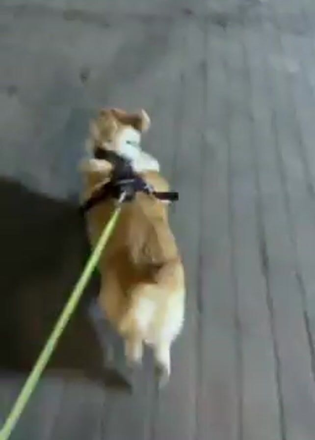 A medium shot depicts a corgi dog walking on a paved surface. The dog has a harness and a leash attached to it. The pavement is made of grey rectangular stones. Another person is visible further ahead and to the left of the dog. The video appears to be taken outdoors at night. The camera is positioned behind the dog.