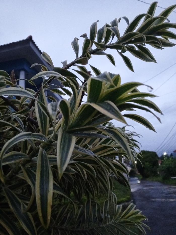 - "The image depicts a close-up of a variegated plant, likely a Dracaena variety, with green and cream-striped leaves covered in visible water droplets, suggesting recent rain or heavy dew" by FM-IQ92v2, licensed under CC BY 4.0