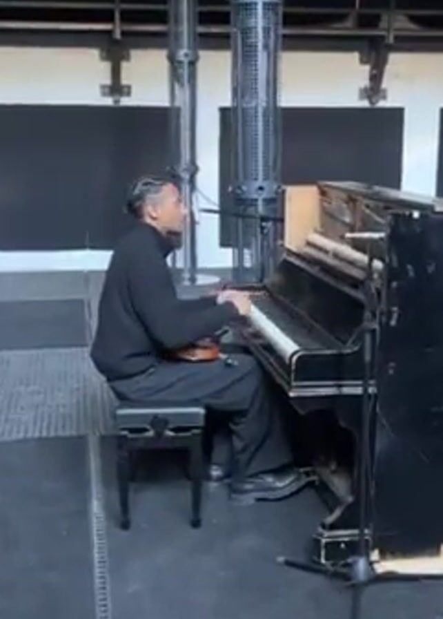 A man is sitting at a black piano on a padded black seat, facing the right side of the piano. He is dressed in all black with his hair in braids. He has his right arm up and appears to be talking to someone off camera. A violin sits on the seat to his left. There are two tall metal cage structures behind him and along the wall are rectangular black panels. The floor is dark and looks like a metal grate. There is a microphone in front of the piano.