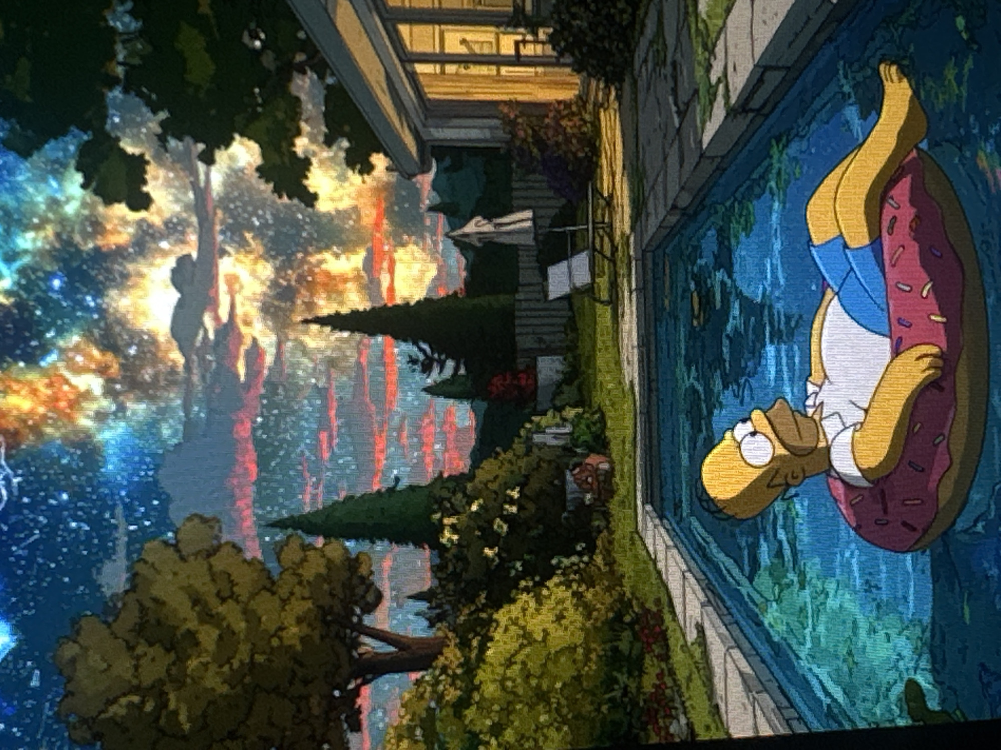 This digital illustration depicts Homer Simpson, a male cartoon character with yellow skin, wearing a white short-sleeved shirt and blue shorts, floating on his back in a swimming pool. He is supported by a large, pink donut-shaped inflatable ring with yellow sprinkles. The pool water is a vibrant blue, with some debris visible on its surface. The pool is bordered by light-colored coping stones. The scene is set in a residential backyard, located in Budapest, Hungary. To the left of the pool, a meticulously maintained lawn with scattered red flowers extends towards a large, leafy deciduous tree and several tall, slender evergreen trees. Dense green shrubbery and bushes fill the background on this side. To the right of the pool, a portion of a modern house is visible, featuring large glass sliding doors that reveal an illuminated interior, indicating dusk or nighttime. A white folding lounge chair and a closed white patio umbrella are positioned on a paved area beside the house. The sky is a prominent feature, transitioning from a dark blue with numerous white stars to a dynamic, colorful display of clouds in shades of orange, yellow, and red, with hints of lighter blue and purple, creating a celestial or fiery effect above the tranquil backyard scene.