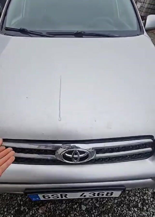 silver Toyota RAV4. The hood is opened to reveal that the engine is missing. The engine bay is filled with gravel. The car is parked in a gravel-covered driveway in front of a house. There is another car parked to the left.