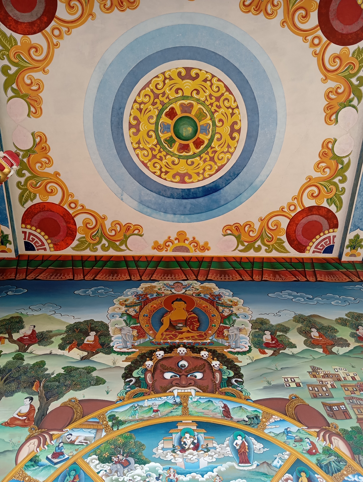 A painting on a ceiling in Lumbini Sanskritik, Nepal, showcases Buddhist imagery