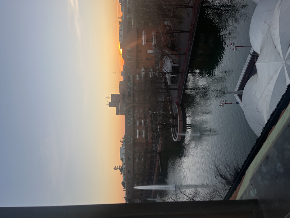 An elevated panoramic view captures the artificial lake system within Milano 2, Segrate, Italy, at sunset. The sky exhibits a gradient from light blue overhead to vibrant orange and yellow at the western horizon, where the sun's disc is partially visible behind distant structures. The central feature is a calm, dark-blue artificial lake or canal, reflecting the sky and surrounding environment. Two water fountains are active: one tall, slender stream on the left, and a shorter, broader stream positioned in front of a circular, tree-lined island in the mid-ground. The island's perimeter is a concrete wall. Along the far bank, multi-story buildings with reddish-brown facades, numerous windows, and multiple balconies line the waterway. These structures feature sloped roofs and appear to be residential or mixed-use. A taller, more complex building with antennae and communication equipment is prominent in the background skyline. Deciduous trees, currently bare, are spaced along the water's edge and on the circular island. A paved pathway and streetlights run parallel to the water on the far bank. In the immediate foreground, from the vantage point of the photographer, a dark vertical structure (likely a window frame) partially obstructs the left side. Below, a dark railing or ledge, equipped with anti-bird spikes, spans the width of the frame. Directly beneath the railing, a large, white, multi-peaked fabric canopy structure is visible, alongside two streetlights with red poles and white, multi-bulb fixtures, positioned near the water's edge. No individuals are discernible within the scene.