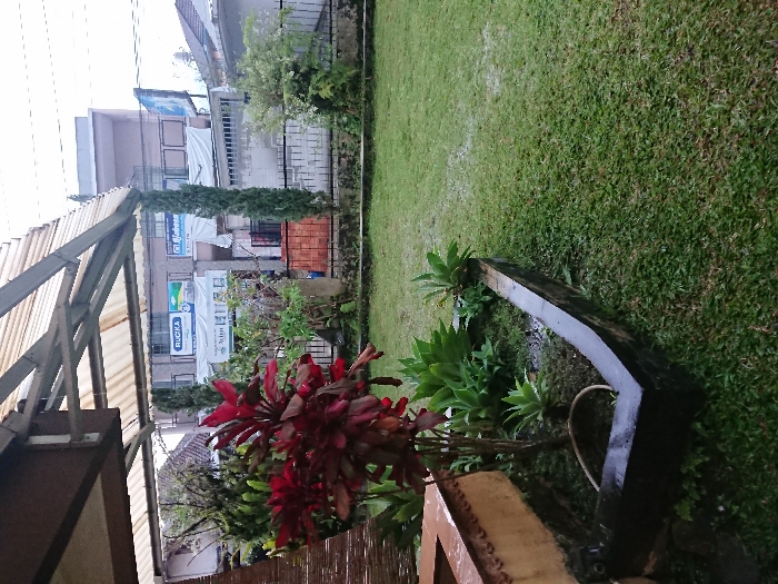 The image displays an outdoor scene in Pacet, Indonesia, viewed from under a covered patio or awning featuring a translucent corrugated roof and a brown wooden support beam. In the foreground, on the left, is a light-colored, textured wall segment, likely part of a planter or architectural element, adjacent to a dark-edged raised garden bed. This bed contains a prominent red-leafed Cordyline fruticosa plant, several green succulent plants, and a coiled white hose. The midground consists of a verdant green lawn, visibly damp with numerous small water droplets, suggesting recent or ongoing rainfall. A black metal fence separates the lawn from the background. Beyond the fence, a commercial street is visible, featuring multi-story buildings. A light-colored two-story building with a balcony is prominent. Commercial signage includes a blue sign for "RUCKA" with a washing machine graphic, another blue sign with a faucet graphic (partially obscured, possibly "JOHNSON"), and a white sign reading "Arim" or "Anim" on a lower awning. Stacked red-orange brick-like materials are present behind the fence. The sky appears overcast. No individuals are visible in the scene.