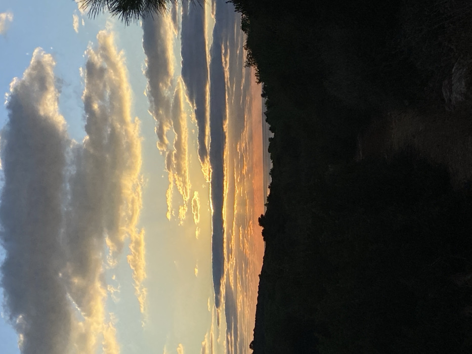 The image displays an outdoor scene captured during sunset or sunrise. The upper portion of the frame features a sky with scattered stratocumulus clouds. The sky transitions from light blue overhead to shades of orange and yellow at the horizon, where the low sun's light creates visible crepuscular rays. Below the horizon, a narrow strip of a dark body of water is discernible in the distance. The foreground and midground are dominated by dense, silhouetted vegetation consisting of dark shrubs and trees. A faint, unpaved dirt path winds through the shadowed foliage in the lower center of the image. No individuals, animals, or artificial structures are present. The scene is located in the city of Unknown, Unknown.
