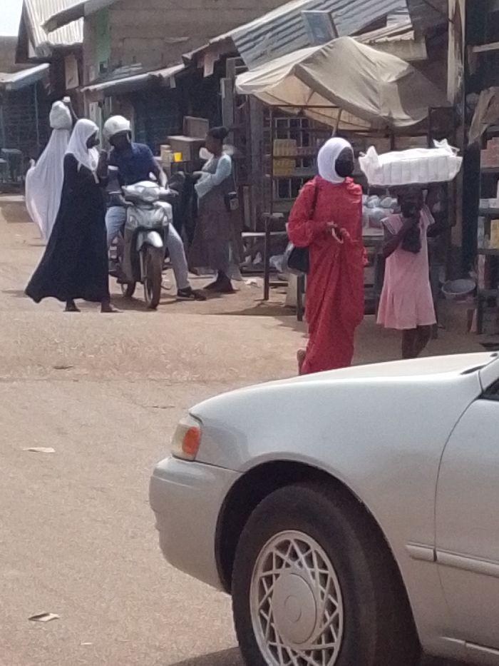 The image captures a street scene in Tamale, Ghana, depicting pedestrian activity and market operations