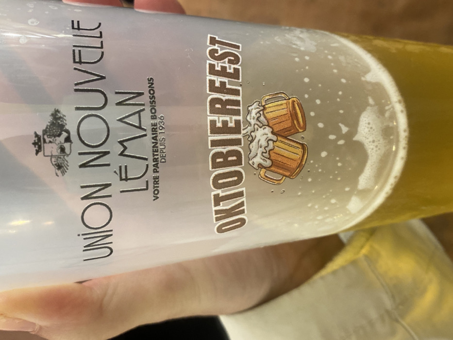 A close-up, eye-level photograph depicts a transparent plastic cup containing approximately 0.5 liters of a golden-yellow, carbonated beverage identified as beer, topped with a substantial layer of white foam. The cup is held by a person's left hand, with the thumb and index finger visible on the left side. The individual is wearing a light-colored, possibly beige or yellow, long-sleeved garment. The cup's exterior features prominent branding. At the top, a crest-like emblem is present, followed by the text "UNION NOUVELLE LÉMAN" in large capital letters. Below this, "VOTRE PARTENAIRE BOISSONS DEPUIS 1936" is inscribed. Further down, the word "OKTOBIERFEST" is displayed in bold, brown block letters, beneath which is an illustration of two traditional, clinking beer steins with overflowing foam. Small bubbles are visible clinging to the interior surface of the cup. Union Nouvelle Léman is a known beverage distributor based in Thonon-les-Bains, France. The presence of the "OKTOBIERFEST" branding indicates the cup is from an Oktoberfest-themed event, likely held within Thonon-les-Bains or its immediate vicinity. The background is out of focus, suggesting an indoor setting, possibly an event venue or establishment.