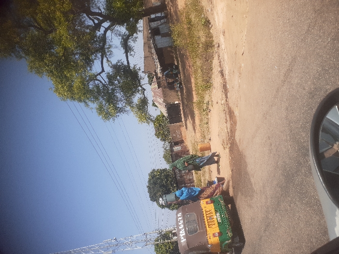 The scene depicts a sunny day along a paved road in Zawan, Nigeria. In the immediate foreground, the grey housing of a vehicle's side mirror is partially visible on the bottom edge. On the left side of the road, a three-wheeled vehicle, resembling an auto-rickshaw, is stationary. It features a green lower section, a yellow middle, and a brown upper rear section. License plate "PTA 6678" is affixed to its rear, with "FGT 7PA" visible below it. Adjacent to the rear of the tricycle stands a person wearing a blue head covering over a patterned garment, balancing a white container on their head. A red-brown bucket rests on the ground nearby. Further to the right, on a dirt shoulder beside the road, another individual stands, clad in a green full-body garment. This person appears to be holding a blue container, and an orange-brown cylindrical container is positioned on the ground near their feet. The road surface transitions to a dirt shoulder on the right, where sparse vegetation, including dry grass and weeds, is present. In the midground and background, multiple simple structures with brick walls and corrugated metal roofs are visible. A large, leafy green tree dominates the right side of the frame, extending towards the clear blue sky. On the far left, a tall metal lattice tower rises against the sky, with multiple overhead power or utility lines traversing the upper portion of the image.