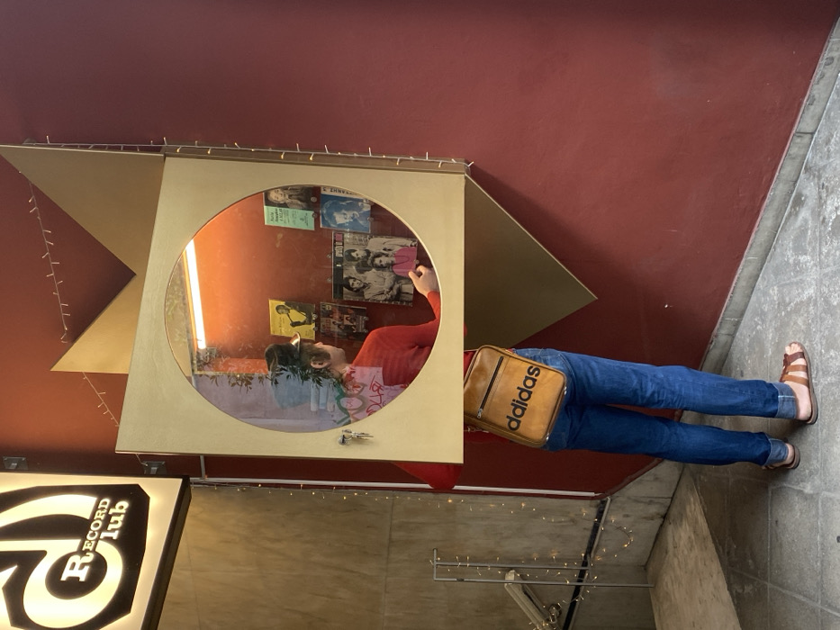 The image depicts an individual standing in front of an outdoor display window at the entrance of the "Record Club" located at Akadimias 57, Athens, Greece. The subject is seen from behind, wearing a red long-sleeved shirt, blue jeans, and brown leather sandals. A tan Adidas shoulder bag with a dark strap is worn across their body. Their reflection in the circular display window reveals a dark fedora-style hat adorned with green foliage, and their left hand is positioned within the display area, interacting with or examining items. The display itself is a gold-colored, geometrically shaped structure mounted on a reddish-brown wall. It features a central circular window showcasing various record album covers, including "Jon Spencer Blues Explosion" and "Pulp." Keys hang from a small hook on the left side of the gold frame. String lights are draped around the display and along the adjacent reddish-brown wall. To the upper left, an illuminated white sign with black text reads "RECORD club." Below this sign, a lighter, textured wall or doorway leads to an interior space. The ground is a light-colored concrete or tiled surface. Faint graffiti is visible on the reflective surface of the display window.