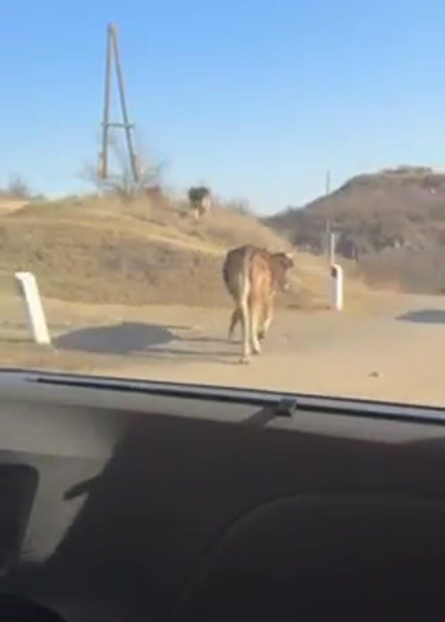 The video, shot from inside a car, shows a herd of cows in a rural outdoor setting