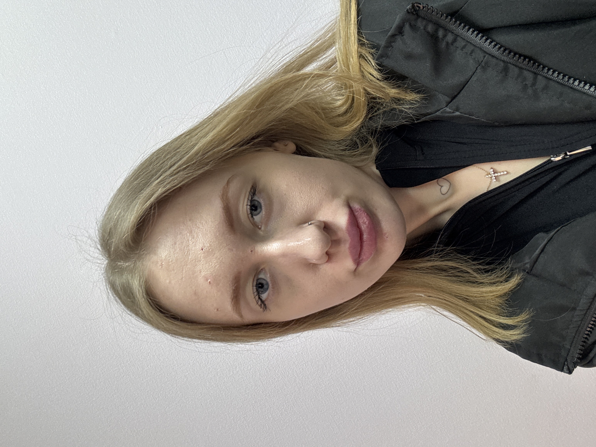A close-up, slightly angled selfie of a young woman with blonde hair. Her face is pale with light blue eyes and full lips. She has a small piercing on her nose. She is wearing a black jacket and a black top underneath. A small heart tattoo is visible on her neck, along with a necklace featuring a cross pendant. The background is a plain, light-colored wall. The photo provides no context suggesting a specific location like Ovoshchnoy, Russia.