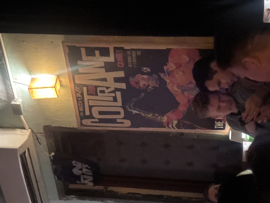 This image depicts the interior of Long With Jazz Club, located at No.30 Nguyễn Khắc Cần, Hoàn Kiếm, Hà Nội, Vietnam. A large poster, prominently displayed on a light green wall, reads "THE MECCA OF JAZZ JOHN COLTRANE QUINTET" and features a stylized illustration of John Coltrane playing a saxophone, rendered in dark blue and red tones, with "RECORDING LIVE 4-5 NOVEMBER 1961" inscribed below. A warm-toned, square wall sconce illuminates the poster and the surrounding wall. To the upper left, a white air conditioning unit is mounted high on the wall. Below the air conditioner and to the left of the poster, a dark, possibly padded panel is visible, above which a black banner with white text partially reads "LONG WITH." In the dim foreground, several patrons are visible. A fair-skinned male with light hair, wearing a dark shirt, is centrally positioned, intently focused on a smartphone held with both hands; a ring is visible on his left ring finger. To his immediate right, the profile of a dark-haired male is discernible, facing left. Additional blurred figures occupy the periphery of the immediate foreground, indicating a social environment.
