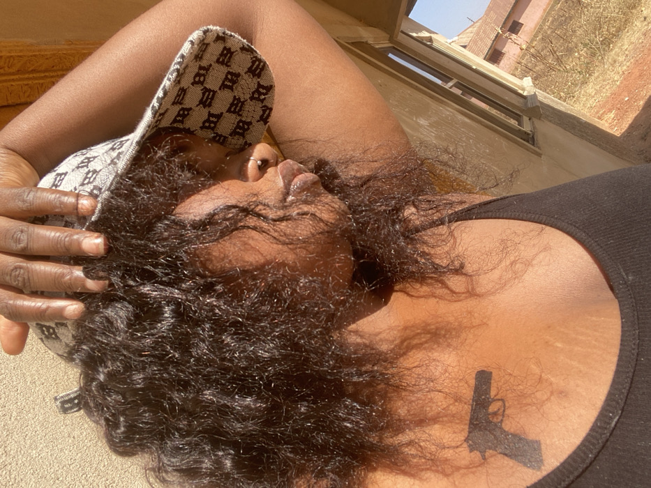 An individual with dark skin and dark, curly hair is depicted outdoors in the city of Rido, Nigeria. The person wears a black tank top and a beige baseball cap patterned with repeating dark brown "M" insignia, worn backwards with the brim angled to the left. A small metallic nose ring is visible on the left nostril. The right hand is raised, with fingers resting on the top of the head, partially obscuring the face, which is turned to the left. A black tattoo of a handgun is visible on the upper left chest, above the left breast, with stretch marks present on the skin below it. Direct sunlight illuminates the scene, casting shadows. The background includes a light-colored wall and, through an opening on the right, reveals a building with a reddish-brown tiled roof and sparse, dry brown vegetation.