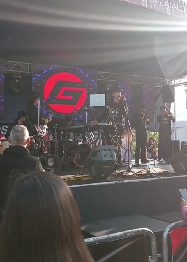live band performing on a stage at an outdoor event. The band consists of several musicians, including a singer, drummer, bass guitarist, and two horn players. The stage is set up with a large screen displaying a logo in the background. The event appears to be a festival or fair, with tents and people visible in the background. Several people are watching the performance, some of whom are recording with their phones. The atmosphere seems lively and festive. The bright sunlight suggests it is daytime. A banner overhead reads "FERIA LOS ALTOS". The barrier in the foreground is marked with "LOS ALTOS".