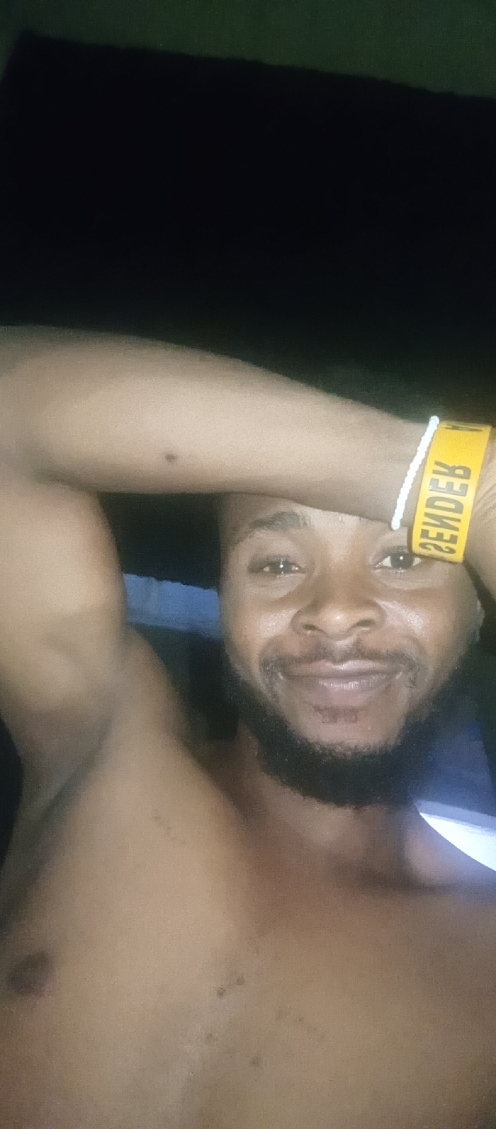 A close-up shot features a shirtless man with dark hair and a neatly trimmed beard, smiling subtly. His arm is raised, slightly obscuring the top of his head. A yellow wristband with white lettering and a strand of white beads are visible on his wrist. The background appears dark, possibly indicating an indoor setting or nighttime. The lighting emphasizes his facial features and skin texture.