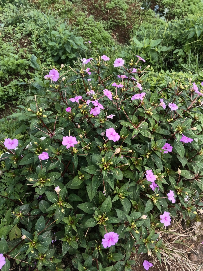 - "A bush of impatiens flowers, characterized by light purple blossoms and dark green, lance-shaped leaves with red veins, dominates the image" by FM-KICT13, licensed under CC BY 4.0