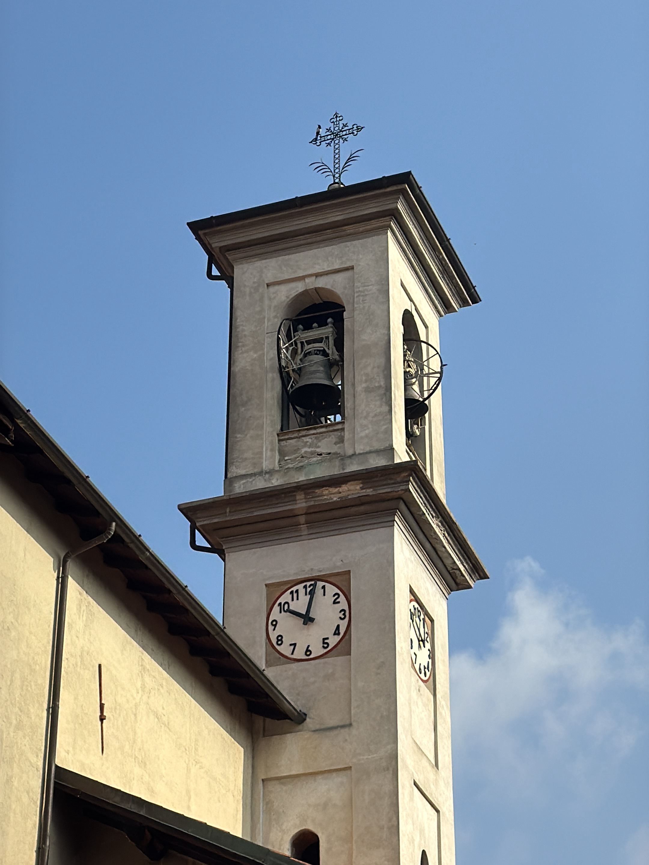 The image displays the upper section of the Campanile (bell tower) of the Basilica di Sant'Abbondio in Como, Italy, under a clear blue sky with some wispy clouds. The bell tower is constructed from light-colored, possibly stuccoed, masonry, exhibiting signs of weathering. At the apex of the tower, a decorative wrought-iron cross serves as a finial. Below this, the bell chamber features two arched openings, each housing a bell. The bell in the left opening is larger and more prominently visible, equipped with a large wooden wheel mechanism for ringing. A smaller bell is partially visible in the right opening, also with an associated wheel. A dark-colored rain gutter runs along the eaves of the tower roof. Further down, on the left face of the tower, a circular clock face is visible. It features a white background with black Arabic numerals from 1 to 12, encircled by a thin red ring. The hour hand points between 12 and 1, closer to 1, and the minute hand points towards the 9, indicating approximately 12:45. A second, partially visible clock face with a similar design is present on the right face of the tower, set further back. To the left of the bell tower, a portion of an adjacent building, likely the main church structure, is visible. This building features a light-colored, textured wall and a brown, weathered rain gutter running along its roofline. Sunlight illuminates the scene, casting subtle shadows and highlighting the architectural details. No people or discernible actions are present.