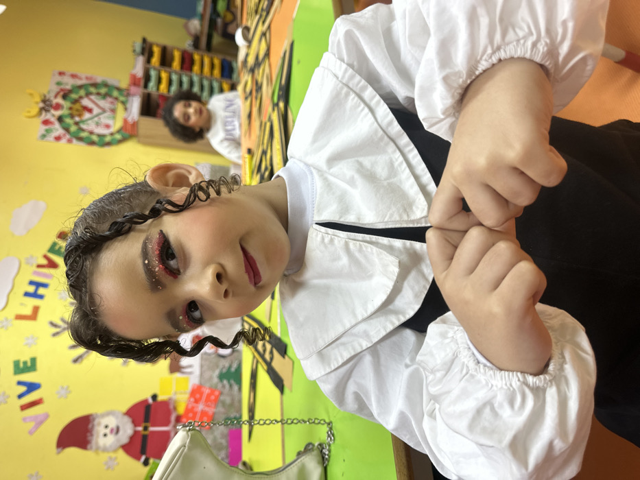 The image portrays a young child, likely female, situated in the foreground of a classroom or kindergarten setting in Salé, Morocco. The specific address within Salé is not discernible from the image. The child has dark, curly hair styled into prominent spirals. Extensive makeup is applied to the face, including red and glittery eyeshadow, noticeably defined dark eyebrows, and reddish lipstick. The child wears a white blouse with a large, pointed collar and puffed, elasticized long sleeves, layered over a dark garment. Both hands are clasped in front of the chest, forming gentle fists with fingers touching. The child's head is slightly tilted, and the gaze is directed towards the viewer with a subtle smirk. In the blurred background to the right, another young child with dark, curly hair is visible, wearing a white long-sleeved top and seated at a table. The environment features bright yellow walls adorned with seasonal decorations. These include colorful letters spelling "VIVE L'HIVER," a large red Santa Claus figure, snowflake cutouts, a stylized winter village scene, and a circular green-and-red holiday ornament with a clock face design. The children are seated at tables; the table in the immediate foreground is green, with an adjacent orange surface to the right. Craft materials, including numerous yellow paper strips, are distributed across the tables. A light-colored bag with a silver chain strap is positioned on the green table to the left. A shelving unit with multiple colorful compartments is visible in the far background.