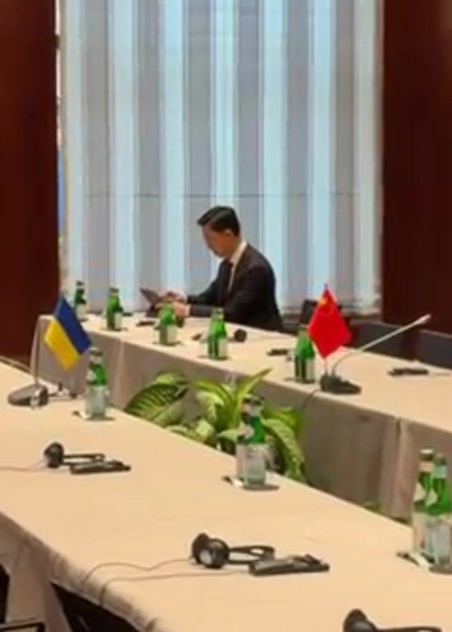 A man in a suit sits at a long table using a tablet. The table is set with microphones, headphones, water bottles, and small flags of Ukraine and China. There is a large striped window behind the man. Someone walks past the camera.