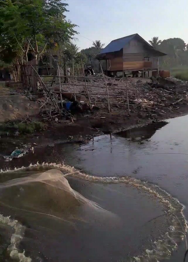 large, light-colored fishing net being cast into a body of water near a shoreline. The net is circular and spreads out as it sinks into the water. On the shore, there's a small wooden house with a blue roof, surrounded by trees. There's also debris and discarded items scattered along the shore. The water appears calm, with slight ripples caused by the net's movement. The sky is bright with a hint of dawn or dusk.