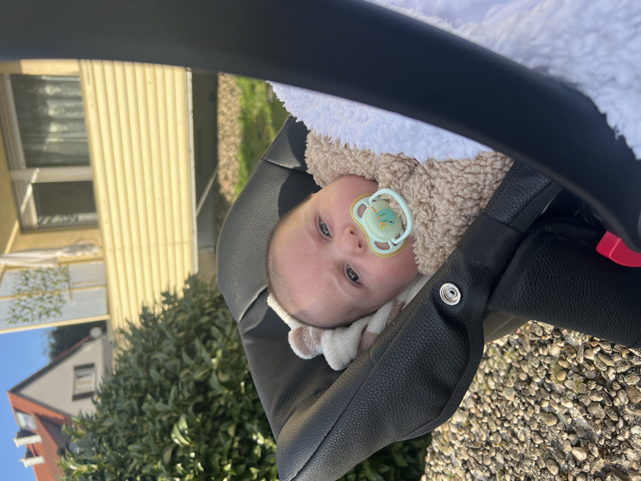 An infant is situated in a black, textured faux-leather car seat or stroller, positioned outdoors on a gravel surface. The infant, with light eyes and fair skin, wears a light brown, fluffy outfit or blanket and has a teal pacifier with a yellow rim and sloth design in its mouth, looking directly at the viewer. A white blanket is visible on the infant's right, and a soft, light-colored object is behind the infant's head on the left. Silver snap fasteners and a partially visible red release button are present on the car seat/stroller. In the background, a dense green bush is visible on the left. Behind the bush, a house with an orange gabled roof and light-colored facade is present under a clear blue sky. To the right, a multi-story building with a light-yellow, horizontally paneled exterior features a balcony with a translucent screen and windows with partially drawn light-colored blinds. The scene is illuminated by direct sunlight. This event occurs in Offenbach am Main, Germany.