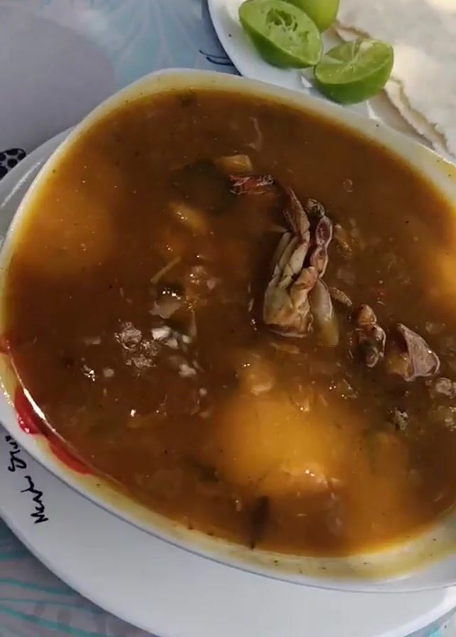 A bowl of crab soup sits on a white plate with a red rim, placed on a table with a blue and white starfish patterned tablecloth. To the side, a small white plate holds lime wedges and folded flatbreads. A hand with a rose tattoo on the wrist reaches for a metal spoon lying on the table next to the bowl. The light creates reflections on the soup's surface.