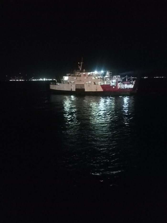 A brightly lit ferry boat is depicted at night in the waters near Gilimanuk, Indonesia