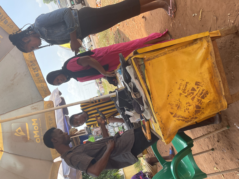 This outdoor scene, situated in Idah, Nigeria, portrays a roadside market stall operating under a large, light-colored umbrella. Five individuals are present around a yellow, weathered wooden stall. A male subject, wearing a checkered short-sleeved shirt and dark trousers, stands on the left, holding a smartphone in his left hand. He is engaged in an interaction with a female subject positioned behind the stall, who wears a black and yellow striped top and also holds a smartphone. Adjacent to her, a second female subject in a bright pink long dress and black hijab stands behind the stall, with her hands near the displayed merchandise. To the right of the stall, a third female subject, dressed in a denim jacket, dark top, and dark skirt, stands separately, engrossed in a smartphone held in both hands. A fifth individual, partially visible on the far left, is seated on a green plastic chair, wearing a purple shirt and light shorts. The central object is a rectangular wooden stall, covered or painted yellow, exhibiting signs of wear and dirt. Displayed on its top surface are various items, including multiple black objects (possibly shoes or accessories), a white cloth, a black box, and a small orange electronic device. The large umbrella providing shade bears "MoMo Payment Service Bank" branding and "Dial *150#" text. The ground is reddish-brown earth. In the background, a dirt road is visible with two vehicles (a white van/bus and a white car), alongside green foliage and distant structures under a clear sky.