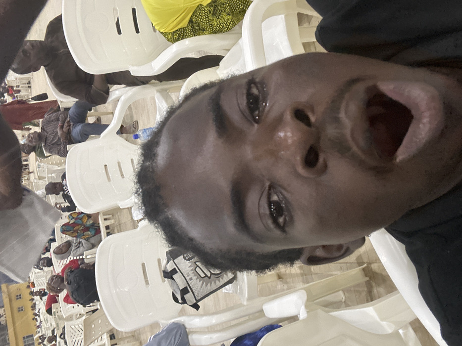 The image captures an indoor public gathering in Shagamu, Nigeria. In the foreground, a young adult male with dark skin, short dark hair, and a dark shirt stares directly into the camera with a wide-open mouth and wide eyes, indicating a selfie perspective. The background reveals a large hall filled with numerous white plastic chairs, many occupied by individuals. Seated attendees include a woman in a red top with a head covering, a person in a grey hoodie wrapped in patterned fabric, an adult male in a striped shirt and jeans, and another adult male in a brown tunic-style shirt. A grey bag with a white graphic rests on a chair, and a blue plastic water bottle is visible on the floor beside a chair. The overall scene depicts a crowded event or assembly within a large, light-colored indoor space.