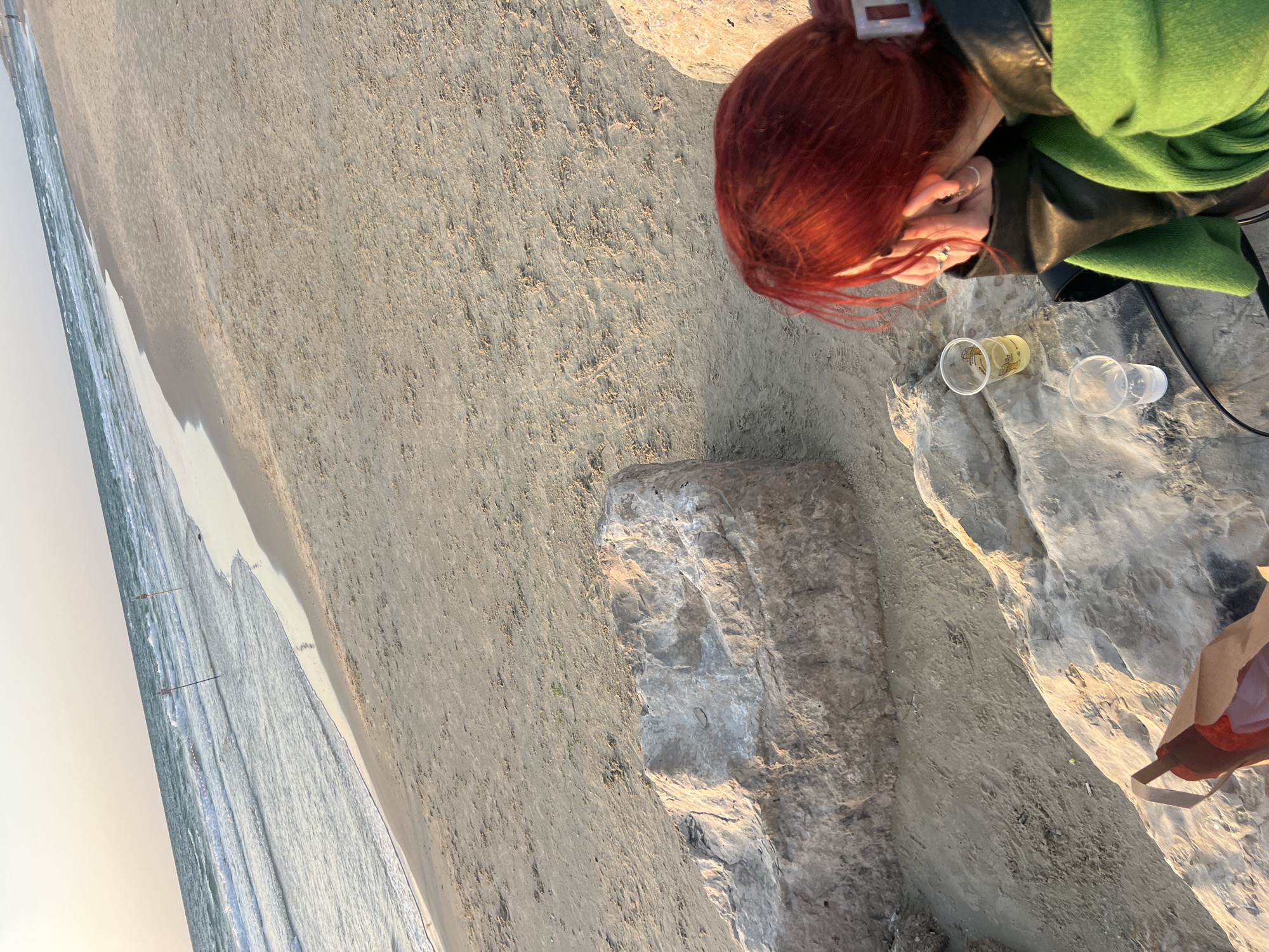 A beach scene in Bat Yam, Israel, shows a woman with auburn hair, dressed in a black jacket and green sweater. She is seated on a light-colored rock formation on the sandy beach. Next to her are two plastic cups, one containing a pale yellow liquid. In the background, the ocean stretches to the horizon, with posts visible in the water, and the shoreline is lined with sand. A brown paper bag is located on the right side of the rock formation. The scene is captured in daylight.