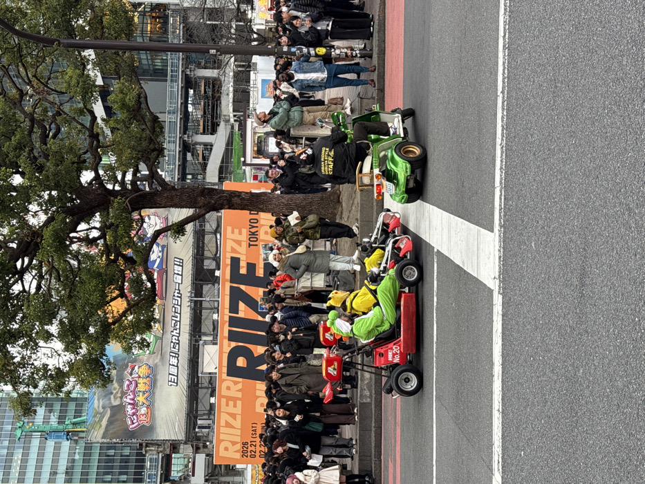 A bustling Tokyo street scene shows costumed individuals in go-karts