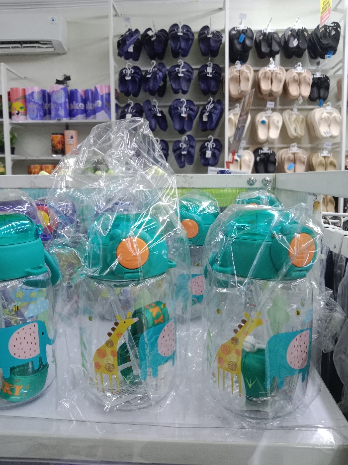 The scene depicts the interior of a retail establishment, presumed to be in the city of Kauman, Indonesia. In the immediate foreground, multiple clear plastic water bottles are displayed on a white counter. Each bottle is individually encased in a clear plastic bag, features a teal green lid with an orange push-button mechanism, and is decorated with cartoon depictions of a light blue elephant and a yellow giraffe. A green straw is visible inside several of these bottles. In the background, two white metal shelving units are visible. The left unit displays various merchandise: the top shelf contains rows of blue cylindrical objects, while the middle shelf holds orange and black cylindrical containers. Partially visible green potted plants are on a lower shelf. Above this unit, a white wall-mounted air conditioning unit is installed. The right shelving unit displays numerous pairs of sandals or flip-flops, sorted by color and suspended on white plastic hangers. The left portion of this unit exhibits dark blue sandals, while the right portion features black, beige, and lighter-toned sandals. No individuals are present, and no actions or interactions are depicted.