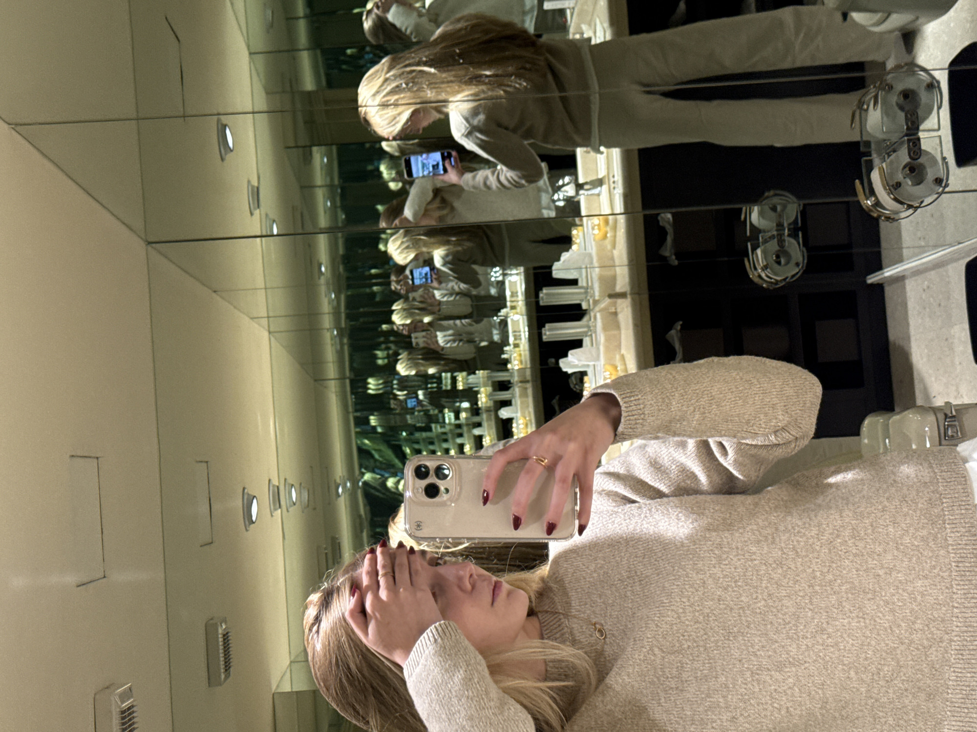A young woman takes a photo of herself in a mirror while in a bathroom, possibly in Mexico City, Mexico. She is wearing a light-colored sweater. Her face is partially obscured by her hand. In the background, multiple reflections of the woman can be seen in a series of adjacent mirrors. The wall features recessed lighting fixtures. Sanitary hardware is present, including faucets.